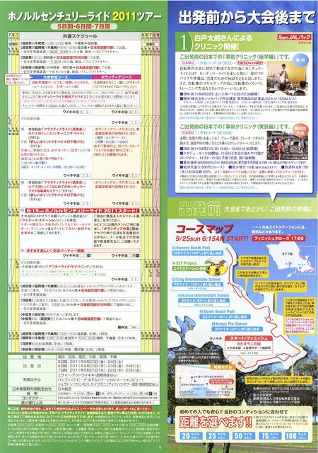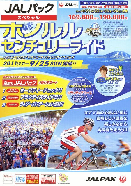 知る人ぞ知る!ハワイセンチュリーライド 日本人が多数参加しハワイを走り抜けるイベントです。 このイベントに参加された方が多いのではないかと! 参加した事ある方は実体験などトピックに書いて下さいね。 ハワイセンチュリーライドは他にもツアーがたくさん出てるかと 思いますので、参考にしてもらえればと思います。