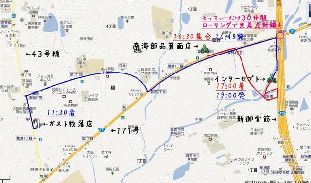 26日の予定について、決定しますのでご確認をお願いします。 もし都合つかない部分があれば、書き込みいただければ再度調整します。 また、移動ルートを添付画像に記入してありますので、確認をお願いします。 ?16:30集合 16:45出発 ・南海部品箕面店 http://g.co/maps/k9d93 ↓ ?17:00着 19:00出発 ・インターセプト見学 ↓ ?19:30着 ・ガスト牧落店で晩御飯 http://g.co/maps/9hw72 グーグルマップ http://g.co/maps/g9pu6