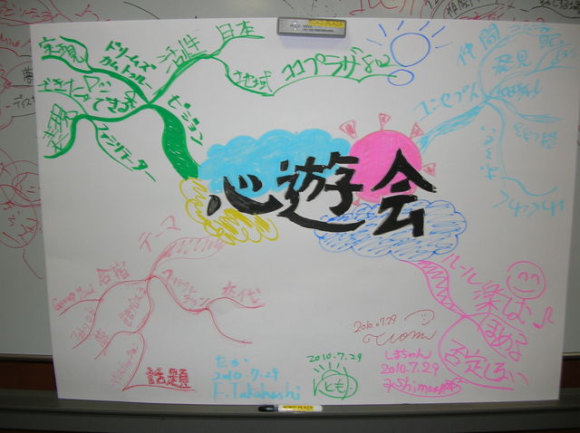 こんにちは、しまちゃんです。 (8月の心遊会の開催のお知らせ)します。 ご都合の良い方は、是非遊びに来て下さいね! では、以下、案内です↓ __________________________ 【日時】 9月26日(月)・19:00〜22:00 【場所】 新大阪ココプラザ 405号室 【内容】 内容は、「第2回心遊会・会議」です。 ちなみに、1回目の心遊会・会議は、一年前に、 僕がファシリテーターとなり、グループマインドマップを書いて行いました。 そのときは、4名で行いましたが、