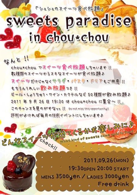 スイーツ好き集まれぇぇぇい 一緒においしいスイーツとお酒で盛り上がりましょう なんと、今回は大阪南船場にある本格スイーツがいただける、 「sweets cafe&bar chou*chou」さんでスイーツメインの飲み会を企画しましたッ スイーツ数種類はもちろん くいしんぼうさんのために、サラダ&パスタ&ドリアも用意してもらっちゃいます しかも、しかも 飲み放題つきーーーーーーーーヤバス ビールも焼酎もワインもカクテルも、50種類以上が飲み放題 ソフトドリンクも