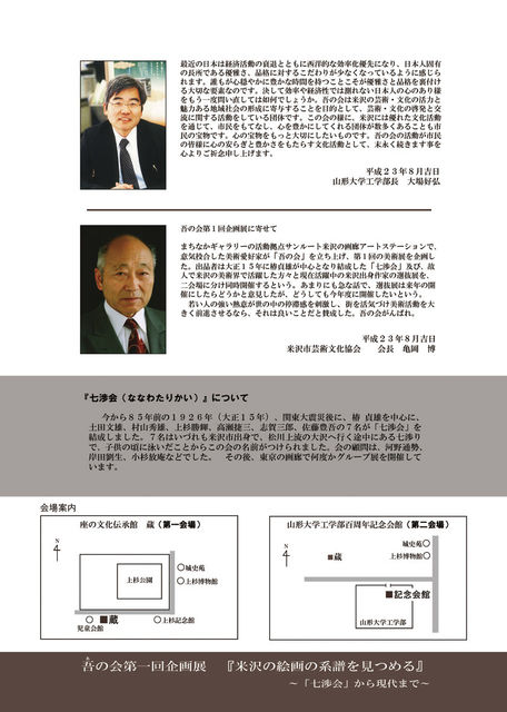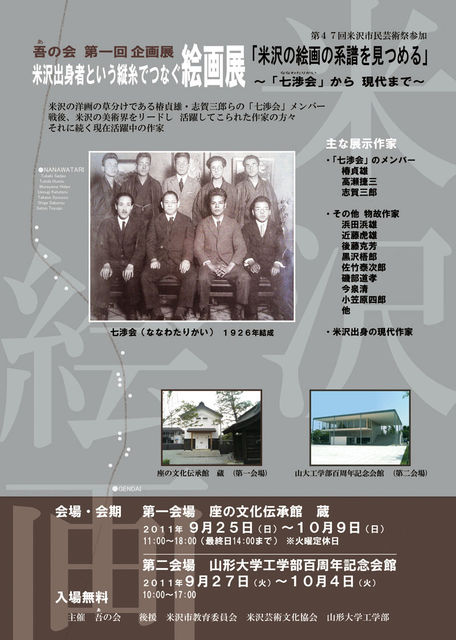 米沢で活躍した画家の作品、現役で活躍している作家の作品を2会場で展示しています。 入場無料です。 ・山形大学工学部100周年記念会館 ・座の文化伝承館 蔵 (児童会館左となり) ニューヨークで活躍した後藤かつよしさんの絵など、普段美術館でないと見れない作品があります。 100号の大作も結構あります。見ごたえあります。 山大生もご覧ください。山大OBのあたくしの絵もあります。 教授も見てください。見てください!!