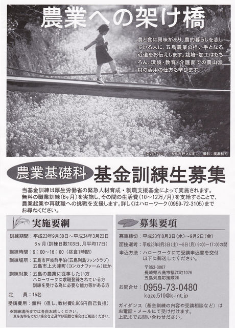 告知失礼致します。 農業研修生(無料の職業訓練)募集 五島列島応援隊株式会社と申します。 農業研修生募集のお知らせです。 厚生労働省の緊急人材育成・就職支援基金によって実施されます。 無料の職業訓練(6ヶ月)を実施し、その間の生活費(10〜12万円/月) を支給することで、農業起業や再就職への挑戦を支援します。 平成23年9月30日〜平成24年3月23日まで6ヶ月(訓練日数103日、月平均17日) の農業研修です。 訓練時間:9:00〜16:00(1時間昼休憩) 訓練場所:五島市戸岐町半泊(五島列島ファンク