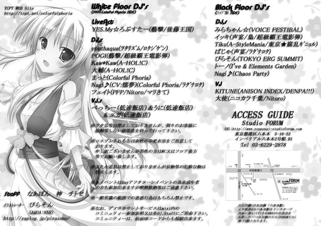 TCPTpresents アニソンクラブイベント 夏の三連戦最後はいつものホーム!秋香る10月、スタジオフォーラムで開催! colorfulphoria(PFP版) VS ライブ厨 - song for anison Mix- @ 六本木studio FORUM[スタジオフォーラム] 2011/10/2(Sun) 15:00〜21:00 open14:00 start15:00 Door2500YEN(1D) TCPTディスカウント&mixiコミュニティ参加表明&フライヤー&Staffディスカウント で男性2000YEN(1D)女性1500YEN(1D) mixiコミュニティ参加表明フォーム http://mixi.jp/view_event.pl?id=64685032&comm_id=5164416