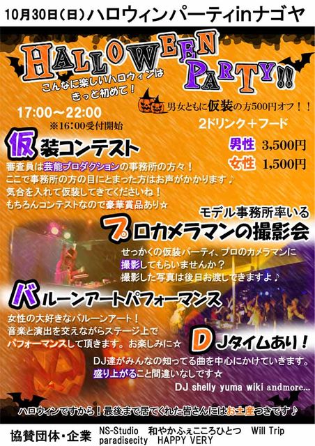 管理人様貴重なスペース失礼します。 10月30日は スペシャルイベントHALLOWEEN PARTYをやります 立食パーティからの 仮装コンテスト バルーンアート DJタイム 更にお土産つき 価格もリーズナブルになってます しかもコンテストの審査員は、芸能プロダクション&一般投票です。 プロダクションの方の目にとまった方はお声がかかりますよ〜 そしてコンテストなので 賞に入った方は豪華賞品がもらえます みなさん仮装してきてくださいね ワンポイ