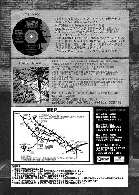 Stamina-D prezents 八曽音楽祭 <Special Guest> ・PAPA U-Gee ・machaco <Guest Sound> ・Real Foundation ・Roots Vibes <Muzik> ・Phoenix ・Natural Size ・Azian Soul <Host Sound> ・Stamina-D with Sound System [場所] 八曽の里キャンプ場(岐阜県多治見市北小木町332 Tel.0572-27-8882) [時間] 22:00〜06:00 [料金] 前売り \2,000- / 当日 \3,000- / 駐車場 \500- <Ticket取り扱い> ・ローソンチケット L-code 45048 ・LION MUSIC DEN Tel.052-953-1386 (愛知県名古屋市東区泉1-17-25 イープ太田ビル2F)
