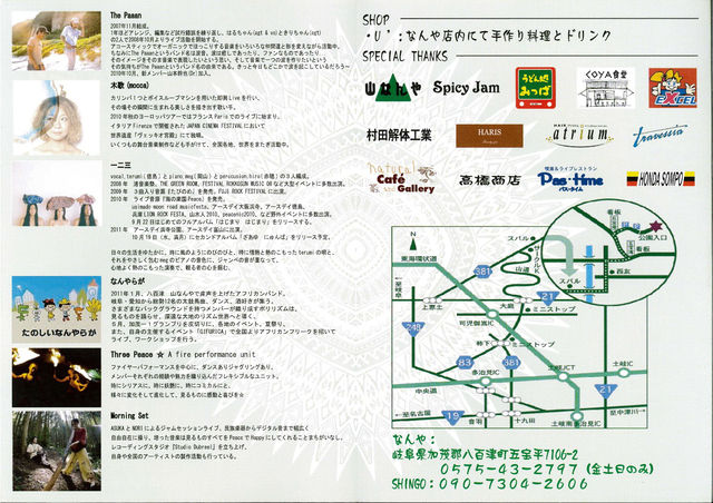 『友U&I愛』 http://mixi.jp/view_event.pl?id=64432913&comm_id=4411834 10月30日(日) ばしょ 岐阜八百津 山ナンヤ 岐阜県加茂郡八百津町五宝平7106−2 http://yamananya.blogspot.com open 12:00 start 13:00 前売り 3,000円 当日 3,500円 ◯LIVE◯ The Paaan 木歌(mocca) なんやらが スリーピース Morning Set 一二三となおき ●お問い合わせ・ご予約● しんご 09073042606 mixi 友U&I愛コミュニティ 山なんやでであったしんごくんたちのイベント 友U&I愛に出演させてもらうよ