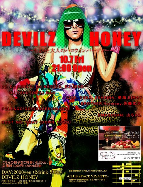 【全身ハロウィン仮装、入場無料】 【ビキニ着用の女性も入場無料】 久しぶりの晴天、皆様いかがお過ごしですか ご来場くださる皆様が主役のイベント、DEVILZ HONEYです! 前回も大盛況盛り上がりで沢山のお客様にご来場頂きました 本当にありがとうございます さて、10/7次回のデビハは「ちょっと大人のハロウィンパーティー」と題しまして、 『全身ハロウィン仮装』でご来場されたお客様は入場料無料とさ