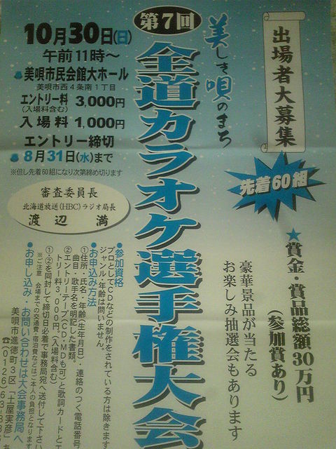 さて10月になりました!今月末今年初のカラオケ大会で〜〜〜す! 全道各地から60組以上の歌好きが集まり競いあいます! 会場も700〜800人くらい入る会場で満員になります! 第3回から参加しているこの大会・・・かなりレベルが高いです! 第3回は「恋」で初参加!結果は無残(〃^∇^)o彡☆あははははっ 第4回は「思ひ」16位 UCCウエシマコーヒー賞受賞(*^ー゜)v 第5回は「ひき潮」9位 優秀歌唱賞受賞!\(@^▽^@)/ 第6回は「祈り」6位 審査員特別賞受賞(◎。◎)! 自分でも信じられないんですがこんな感じでがんば