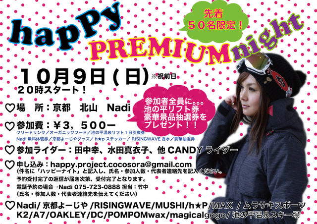 mushi展示販売 そしてmushi姉妹ブランドh★pの予約販売がある 田中幸主催のイベントです happy projectスタッフもいるので ぜひ遊びにきてね★ 京都北山は観光もできるから 関西の人、関西じゃない人もぜひ来てね★ はやく皆に見せたいものばかり!! 待ってます(o^^o) haPpy★PREMIUM★night 京都・北山 ○日時 10月9日(日)※翌10日祝日 19時 受付 20-22時 フリードリンク・オーガニックフード※オードブル 23時 終了 ○場所 Nadi ナディ※地下鉄・北山駅 徒歩5分 京都府京都市北区上賀茂