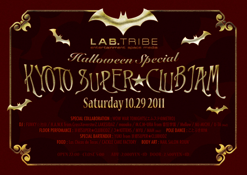 管理人様、貴重なスペースお借りいたします。 不適切であれば削除願います。 2010年も大好評だった、 京都を騒がすパフォーマー京都SUPER★CLUBKIDZとLAB.TRIBEがタッグを組んだ、BIG PARTY!! 同日METROで開催のエムステ~halloween party~とのコラボ企画や、 POLEダンサーの登場、 プライベートダンサーのいるVIP ROOMがあったり、 スペシャルカクテルやフードブースなど、コンテンツ盛りだくさん! もちろん、仮装SNAPをばっちりおさめてくれる、プロのカメラマンさんも! 豪華賞品多数の仮装コンテスト(前売りチケット