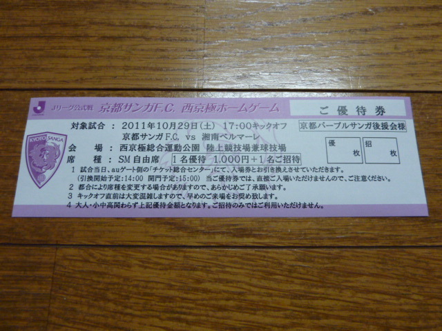 ▼イベント内容▼ 京都サンガF.C.から、1枚でSMに1000円で2人入れる優待券を頂きました。 ただし、大人も子供も同じ料金です。 (未就学児童を除く) あと、1人でも1000円です。 要は、このチケットを持っていると、最初の1人は一般当日価格2800円の SM席が1000円、2人目はご招待、ということです。 ということで、参加人数が偶数なら、全員が500円づつ出せば、 みんなでSMで見られる、という訳です。 (年パスをお持ちの方もおられますので、参戦場所は基本自由にします) mixiのみんなで一緒に応援し、田原豊の