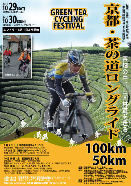 要望があったのでイベントを建ててみました。 京都・茶の道ロングライド http://chanomichi-cycling.info/ 定員500名 Aコース100km 4,000円 Bコース 50km 2,000円 コース詳細 http://www.fa-bu.com/fabu/watuka2.html A.100kmコース スタート時間 午前8時 最終ゴール時間 午後2時30分(制限時間6時間30分) B.50kmコース スタート時間 午前8時30分 最終ゴール時間 午後0時30分(制限時間4時間) サイクリング中のお楽しみグルメ 笠置 焼きドーナツ、和菓子、焼き芋、ぜんざい、きじ釜めし