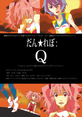 怪しい雰囲気に包まれた『だん☆れぼ』のHalloween Party... 可愛い仮装から、本格コスプレまでなんでも装ってOK★ もちろん私服で遊びに来てもいいんだよ♡ 美味しいお酒と大好きなアニソンで身体をゆらゆら★ 静岡でアニソンクラブイベントを楽しめるのは『だん☆れぼ』だけ! ☆☆開催決定☆☆ 静岡のオタクカルチャーを大いに盛り上げていこう!! メイド・イン・静岡のアニソンクラブDJイベント!!! 『だん☆れぼ』 第Q話 〜Trick or trick!!!お菓子をあげるのでいたずらして下s(ry〜 ■日時 2011/10/1