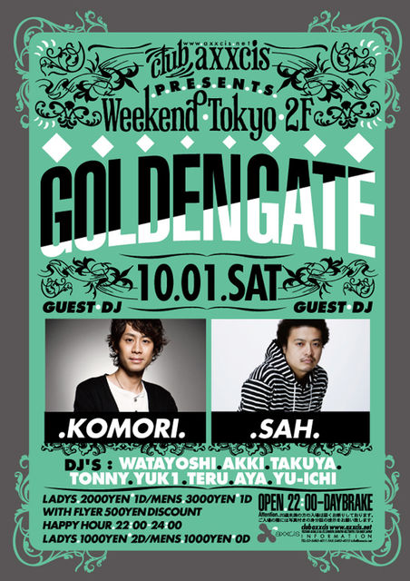 管理人様告知失礼致します。 10/1(土)「GOLDEN GATE」@axxcis ★★★★★ メッセージ頂ければ、ゲスト料金にてご招待させて頂きます!! 代表者名とだいたいの人数をメッセージ下さい!! 折り返しメッセージ致します!! ★★★★★ ☆☆☆☆☆ メッセージ頂かなくても、エントランスにて「ユキのゲストでアクシス」とお伝え頂ければ、何名様でも同じくゲスト料金にてご入場頂けます!! お気軽にご利用ください!! ☆☆☆☆☆ ※ゲスト料金※ 24時までに入場→男性1000円/0D、女性1000円/2D 24時以降に入場→一律1500円