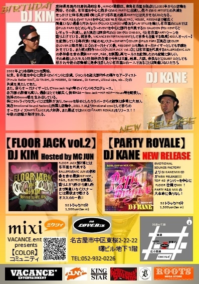 ゲットチケットはこちらから http://mixi.jp/home.pl?from=h_logo ●PLUSPARKで毎月第2土に開催されていた爆発的な人気パーティーで知られ常に【400人以上】の動員数を記録し続けてきたモンスターDJPARTY【COLOR】が毎月第1土に9月から@CLUB LOVER:Zにて完全復活!!!!! COLOR RESIDENT DJのDJKIMのMIX、DJ KIM×MC JUNのMIXCDが今ならネットで送料込み\1000-で販売中!!!!   FLOOR JACK シリーズのvol.2 は残りわずかです。チェックを☆ http://item.rakuten.co.jp/vacance/djkim02/ 【10月1土】 第一土曜!!ALLNIGHT!!!