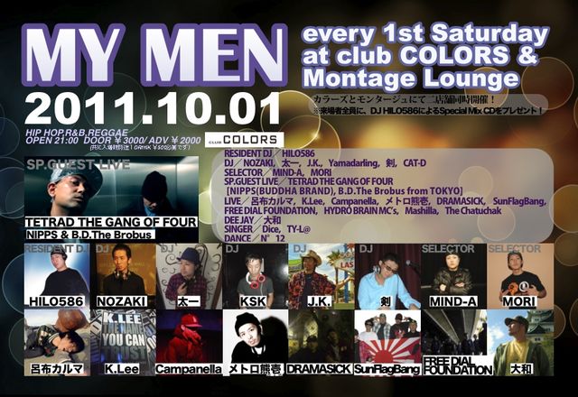 ■10月1日(土) MY MEN vol.127 @CLUB COLORS&Montage Lounge(カラーズとモンタージュにて二店舗同時開催!!) HIP HOP,R&B,REGGAE OPEN 21:00/DOOR ¥3000/ADV ¥2000(共に入場時別途1DRINK ¥500必要です) ※来場者全員に、DJ HILO586によるSpecial Mix CDをプレゼント!! <RESIDENT DJ> HILO586 <DJ> NOZAKI,太一,KSK,J.K.,Yamadarling,剣,CAT-D,ImaChu-N <SELECTOR> MIND-A,MORI <SP.GUEST LIVE> TETRAD THE GANG OF FOUR [NIPPS(BUDDHA BRAND), B.D.The Brobus from TOKYO] <LIVE> 呂