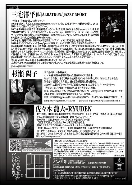アライさんいつも御世話になっております。 告知失礼致します。 2009年惜しまれながら解散した伝説のレゲエバンド「犬式」のヴォーカリストで、現在「(仮)ALBATRUS / JAZZY SPORT」の「三宅洋平」さんの貴重な貴重なアコースティックライブ! そして「6/15」に1stアルバムを発売し、いまや関西一勢いのある女性アーティスト「杉瀬陽子」さん。 2年前に関西初ライブをし、大反響があったRYUDENのヴォーカル「佐々木龍大」さん。東日本大震災を乗り越え、モンスターズキャバレーにソロにて再登場です! MONSTER'S CABARET vo.8 【日時】