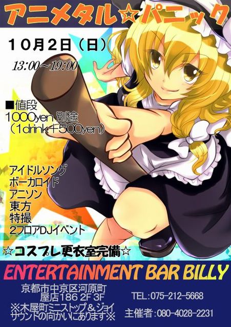 アニメタル☆パニックvol.3 奈良のサブカルイベント、アニメタル☆パニックがこの度京都にて開催します。皆様のご来場お待ちしております。 コミュニティ↓↓ http://mixi.jp/view_community.pl?id=5297958 ■開催日 10月2日(日) ■時間 13:00時〜19:00時 ■場所 :「ENTERTAINMENT BAR BILLY 」] 京都市中京区河原町材木町186 2F 3F ※木屋町ミニストップ&ジョイサウンドの向かいにあります※ http://g.co/maps/vuyu ←この辺です TEL 075-212-5668 YOSI 090-9