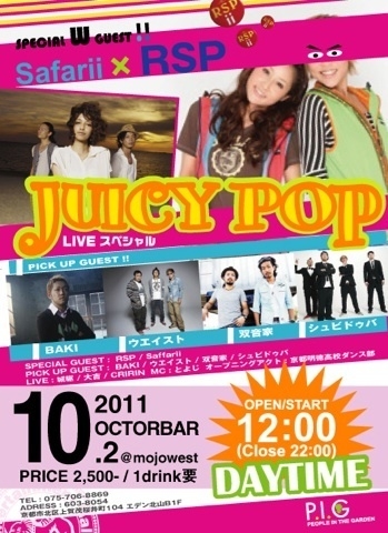 2011.10.2(日) 『JUICY POP liveスペシャル!!』 @京都北山 MOJO WEST http://www.mojowest.com OPEN 12:00〜 CLOSE 18:30 チケット : \2500- 一般 \1500- 高校生以下 *会場入場時にドリンク代 500円必要 SUPECIAL GUEST: RSP / Safarii GUEST: BAKI / ウエイスト / 双音家 / シュビドゥバ PICK UP LIVE: 大吉 / CRIRIN (名古屋) / 城駆 SUPECIAL OPENING ACT: 京都明徳高等学校 ダンス部 HOST MC: とよじ JUICY POPだけの!! SPECIALなコラボレーションLIVEありますっ!!!! 問い