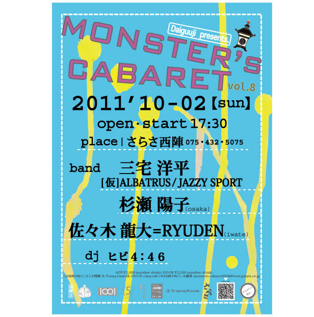 MONSTER'S CABARET vo.8 【日時】 2011/10/2 (日曜日) 開場・開演 PM17:30 【会場】 さらさ西陣 (京都市北区) http://sarasan2.exblog.jp/ 【出演】 ■三宅洋平 ((仮)ALBATRUS / JAZZY SPORT) http://www.youtube.com/watch?v=XzYspazBH4k&feature=related http://www.youtube.com/watch?v=JcUEPpBHLUk&feature=related ■杉瀬陽子 (大阪) http://www.youtube.com/watch?v=7Od_g61AAho&feature=related http://www.youtube.com/watch?v=_kGMFkyJ6-0 ■佐々木龍大=RYUDEN (岩手) http://www.youtube.com/watch?v=