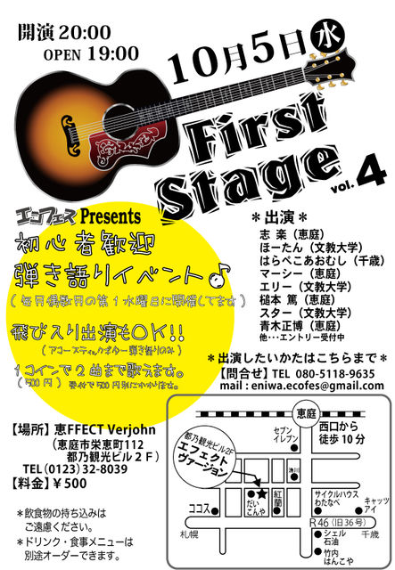 明日は座って聴けるゆるーいアコースティックイベントです エコフェスPresents 「First Stage #4」 飛び入りも出来るので、様子を見ながら飛び入りしてみてもOK! 2011年10月5日(水) Start*20:00〜22:00 料金*500yen 場所*恵FFECT Verjohn(恵庭市栄恵町112 都乃観光ビル2F) ココスの近く *出演* ・志楽(恵庭) ・ほーたん(文教大学) ・はらぺこあおむし(千歳) ・マーシー(恵庭) ・エリー(文教大学) ・槌本 篤(恵庭) ・スター(文教大学) ・青木正博(恵庭) ☆★☆★☆★☆