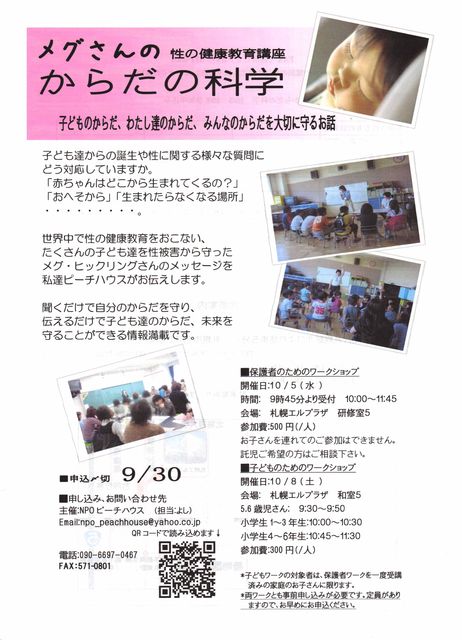 管理人様 貴重なスペースをお借りします。ありがとう感謝です。 子ども達からの誕生や性に関する様々な質問に どう対応していますか 「赤ちゃんはどこから生まれてくるの?」 「おへそから」「生まれたらなくなる場所」 ・・・・・・・・・。 世界中で性の健康教育をおこない、 たくさんの子ども達を性被害から守った メグ・ヒックリングさんのメッセージを 私達ピーチハウスがお伝えします。 聞くだけで自分のからだを守り、 伝えるだけで
