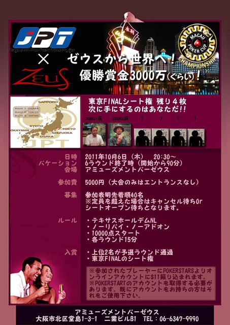 JPTサテライトも大阪では、あと3回となりました。 是非ファイナルのシートを持って東京で勝ち上がり、マカオで勝利を手にして みては…!! ◇開催場所 アミューズメントバーZEUS TEL 06-6988-6474 ◇日時 10/6(木) 20:30〜スタート (バケーションは6ラウンド終了まで) ◇参加費 ¥5000(エントランス込 1DRINK付) ◇参加人数 40名(先行予約順になりますので、早めの予約をお願いします。) ◇入賞 上位2人が東京ファイナルシート権 ※1位から5位にゼウスマンスリーseasonファイ