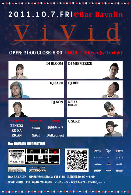 管理人様、告知失礼いたします。 【vivid】 @Bar Bavalin 10.7(fri) DOOR: 1,000yen(w/1drink) -Pick Up Artist- BENZO3 KO-KA RICAN -DJ- MESMERIZE BLOOM SARU RIN NON -Support DJ- N@mi NAGI -Dancer- 猶興きゃ? DAB.conect -Host MC- REIZA 毎月第一金曜日に宗像はBar Bavalinにて開催しているExclusive HIP HOP,R&B PARTY【vivid】!! 今回はPickup Artistとして、BENZO3、KO-KA、RICANを招いて開催!! 【vivid】が提案する唯一無二のグルーブ感を堪能しに、