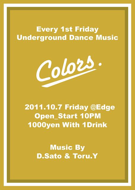 edge 第1金曜のCOLORS.です。 今月もよろしくお願いします! ☆COLORS.☆ 2011.10.7 Friday @Edge ■Open_Start 10PM ■1000Yen With 1Drink ■Music By D.Sato & Toru.Y □Underground Dance Music http://www.d-colors.jp
