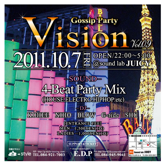 "Vision" Gossip Party 2011.10.7(FRI) @sound lab JUICY OPEN:22:00〜5:00 DJ: KOHEE. NIHO. BLOW. G-ride. SHU. PANTY MC: ALIVE SOUND: 4-Beat Party Mix (HIPHOP.ELECTRO.HOUSE.etc) ENTRANCE FEE/MEN:¥1500(1D) LADIES:¥1000(1D) 協賛店 日焼けサロン g-style 084-921-7003 http://mixi.jp/view_community.pl?id=2657686 TATTOO STUDIO E.D.P 084-945-9041 http://mixi.jp/view_community.pl?id=1457381 sound lab JUICY 福山市元町13-8 084-926-8821 http://mixi.jp/vi