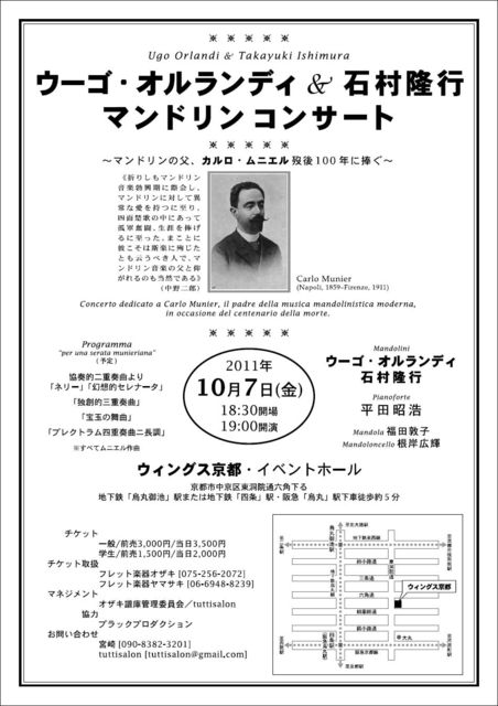 ムニエル歿後100年にちなみ、世界のオルランディと愛弟子・石村が久々の共演!二重奏からカルテットまで全曲ムニエル作品。 「六つの協奏的二重奏曲」より 「ネリー」「幻想的セレナータ」 「独創的三重奏曲」 「宝玉の舞曲」 「プレクトラム四重奏曲ニ長調」 マンドリン:ウーゴ・オルランディ、石村隆行 ピアノ:平田昭浩 マンドラ:福田敦子 マンドロンチェロ:根岸広輝 一般3000円 学生1500円(当日500円増) チケット:フレット楽器オザキ、フレット楽器ヤマサキ マネジメント:オザキ譜庫管理委員会 お問合