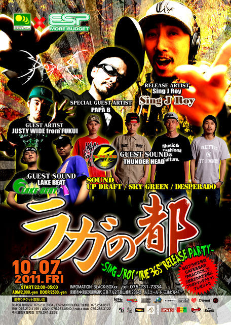 大人気企画「ラガの都」今回は新京極のイケてる服屋「ESP morebudget」と共同企画!! SING J ROYの「IRIE365」RELEASE記念PARTY 親交の深いPAPA Bがブラボに初登場!! そして地元福井のARTIST「JUSTY WIDE」も参加! シークレットゲストは遊びに来てくれた人だけのお楽しみ♪ 今回は入場者先着順に「IREI365」のタオルをプレゼント! 更にブラボ2号店「PEACOCK」で当日御飲食された全員にブラボドリチケをプレゼント! 京都のお馴染みお祭り騒ぎの「ラガの都」にまよわずいらっしゃいませ〜 「ラがの都」 〜SING J ROY RELEASE P