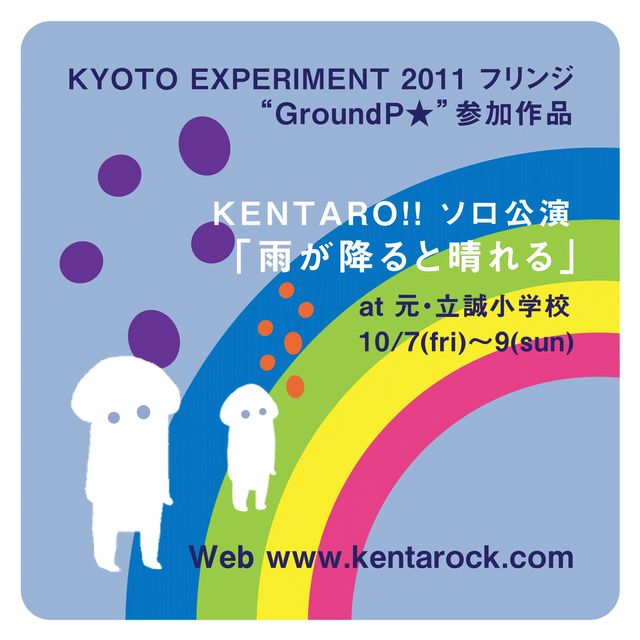 KENTARO!! 『雨が降ると晴れる/小学校バージョン』 ダンス・振付・音楽 KENTARO!! 公演日時 10/7(金)20:15* 10/8(土)14:30/19:00 10/9(日)17:00/20:15 チケット料金 一般2300円 学生2000円 リピーター1000円 (前売/当日共) チケット取扱 Crackers boat Web http://www.crackersboat.com/ E-mail info@crackersboat.com TEL 090-3585-7507(クラッカーズボート/公演期間中のみ) 作品解説 今日も良い天気だと思っていたら、雨が降ってきた。 でも「そんなのが人生なんだ」って思ったりす