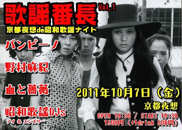 10/7(金) 「歌謡番長 vol.1 〜京都夜想de昭和歌謡ナイト〜」 出演:バンビーノ / 野村麻紀 / 血と薔薇 DJ:昭和歌謡DJs アイ&エンズリー OPEN 18:30 / START 19:30 \1500(+1drink \500)