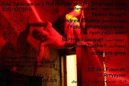 管理人さま、告知させて下さい 10.7 (fri) fake JuNkroom vol.3 Phil Norton aka Preacherman Says (performance poet + music + visuals) http://www.preachermansays.com/preachermansays/Home.html Naked Mozart http://nakedmozart.com/Naked_Mozart/Foyer.html Andrew Couzens (sound, image)+ 袋坂ヤスオ(dance) + ryotaro(acc,synth) http://vimeo.com/10321748 http://www.geocities.jp/fkrzkys0/ http://www.ryotaro.info/ Bertrand Gauguet (from France)+ Isabelle Duthoit( from France) http://www.b