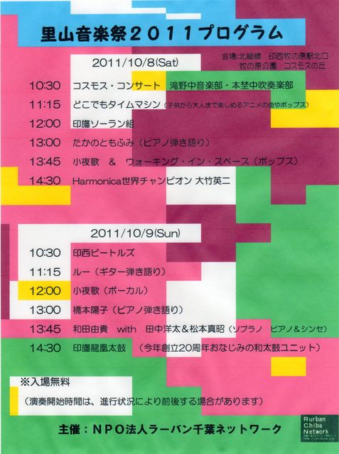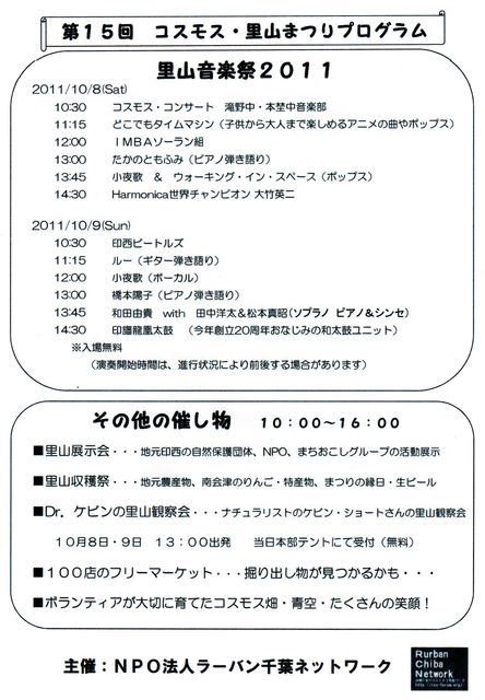 ◎日時…2011年10月8日(土)9日(日)10時〜16時 ◎場所…北総線 印西牧の原駅北口 牧の原公園「コスモスの丘」 ◎駐車場…会場内及び牧の原モア(3時間無料)、BIGHOP(4時間無料) ◎催し物…里山収穫祭、里山音楽祭、里山観察会、フリーマーケット 他多数 ◎コスモス畑面積…約8,000平方メートル ◎来場者…まつり2日間3万人(期間中5万人) ★お問い合せ先/NPO法人 ラーバン千葉ネットワーク(代表‥一島正四) TEL0476-42-4143(10時〜17時) ホームページ…http://rcn-forum.org/