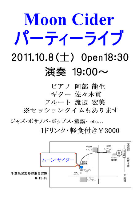 あんなに暑かったのに、ここのところ寒くなってきましたね。 皆々様も体調管理に気を付けてくださいまし。。。 寒くなっても演奏は熱く!! ってゆ〜ことで、Moon Cider のライブのお知らせです!! なんていっても出演者すら当日のプログラムを知らないというライブです! おそろし〜ですね〜! こわいですね〜! こわいもの見たさってあるでしょ? でしょ?でしょ?でしょ? じゃあ、いらっしゃいまし〜!!