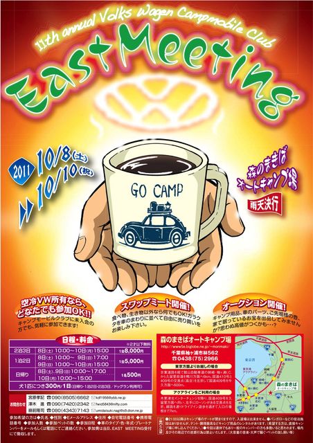 イベントの告知をさせてください。 空冷VWで集まってキャンプをするイベントです。 カーショーはありません。スワップミートは自由です。(食べ物の販売は付加) まったり、ゆったりキャンプして、VW話で一杯やりましょう! 11thannual VWCMC EastMeeting 1、開催日:2011年10月8日(土)〜10日(月)二泊三日 2、会場:千葉県袖ケ浦市「森のまきばオートキャンプ場」 3、参加条件:空冷VWでキャンプ出来る方 4、参加費:二泊 車1台5人まで 8,000円 一泊 車1台5人まで 5,000円 日帰り 一人500円
