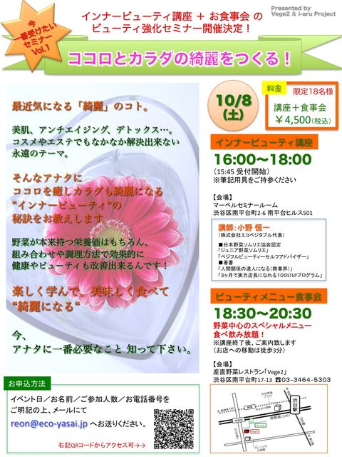 ★ご案内、失礼致します<(_ _)> ※「i-aru Project」では下記のようなイベントなども企画しています。 ご興味ある方、イベントをやってみたい方、アクセスして下さい。 ★ー☆ー★ー☆ー★ー☆ー★ー☆ー★ー☆ー★ー☆ 10/8(土)16:00〜 産直野菜で大人気のレストラン「Vege2」と Happy&元気を発信している「i-aru Project」の共同主催で 今、一番受けたいセミナーvol.1 「ココロとカラダの綺麗を作る!」を開催します! 「Vege2」イケメンオーナーであり、 野菜ソムリエやベジフルビューティアドバイザーの資格も持ち