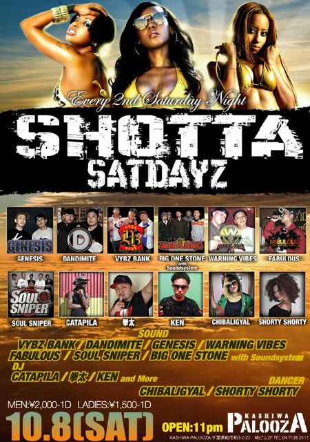 告知失礼致します。 SHOTTA SATDAYZ OPEN 11pm〜 MEN:\2000-1D LADIES:\1500-1D 【SOUND】 VYBZ BANK / DANDIMITE / GENESIS / WARNING VIBES / FABULOUS / SOUL SNIPER / BIG ONE STONE with SOUND SYSTEM 【DEE-JAY】 CATAPILA / KEN / 拳太 【DANCER】 CHIBALI GYAL / SHORTY SHORTY PALOOZA 千葉県柏市柏3-2-22 林ビル2F TEL 04-7136-2111