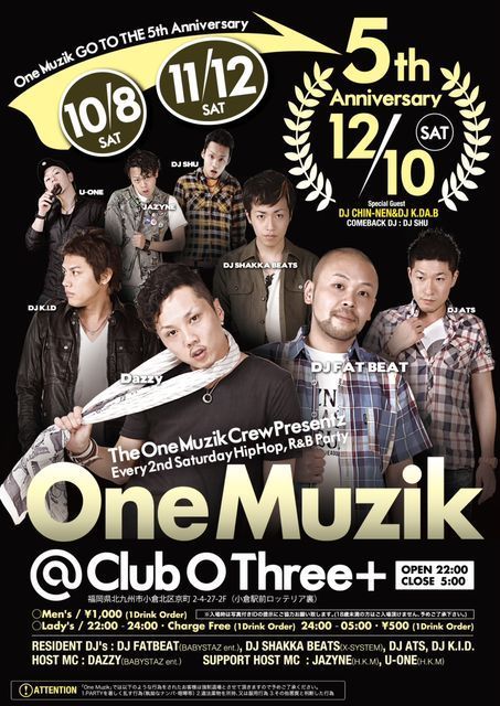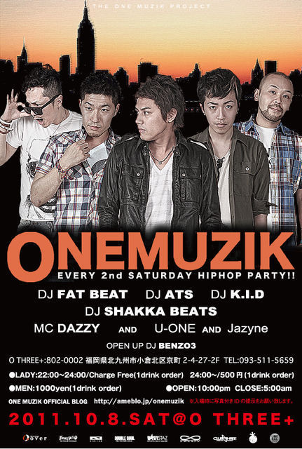 -Every 2nd Saturday Hip Hop & R&B Party- One Muzik@O Three+ 2011/010/08(2nd SAT) OPEN 22:00 CLOSE 5:00 ※入場時は写真付きIDの提示にご協力お願い致します。(18歳未満の方はご入場頂けません、予めご了承下さい。) □Men's ・\1000(1Drink Order) □Lady's 22:00〜24:00・Charge Free(1Drink Order) 24:00〜05:00・\500(1Drink Order) ■DJ DJ FAT BEAT (BABYSTAZ ent.) http://mixi.jp/show_friend.pl?id=336152 DJ SHAKKA BEATS (X-SYSTEM) http://mixi.jp/show_friend.pl?i