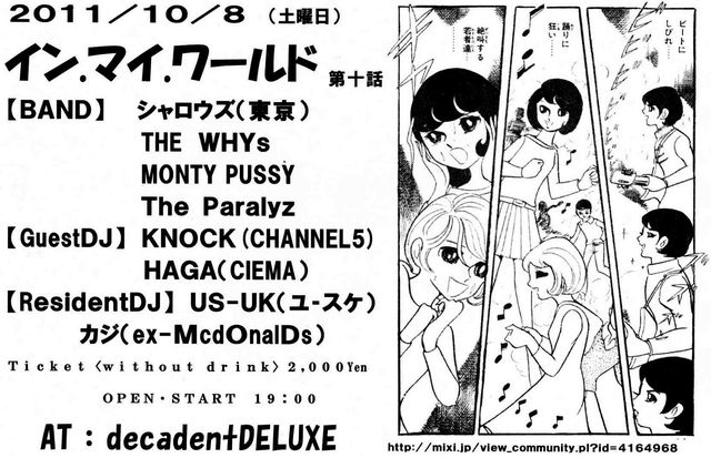 和モノ、カルトGS、グルーヴ歌謡、 60’sガレージ、R&B、 なんでもござれのワイワイガヤガヤDJパーティー、今回はスペシャル版です!! 2011/10/8 【イン.マイ.ワールド 第10話】 at:decadentDELUXE (福岡市中央区舞鶴1-8-28 5F)TEL 092-761-9111 OPEN・START 19:00 Ticket〈without drink〉 2,000yen 【BAND】 ザ・シャロウズ(東京) THE WHYs MONTY PUSSY (ex-thee 50's high teens) The Paralyz 【ゲストDJ】 KNOCK(CHANNEL5