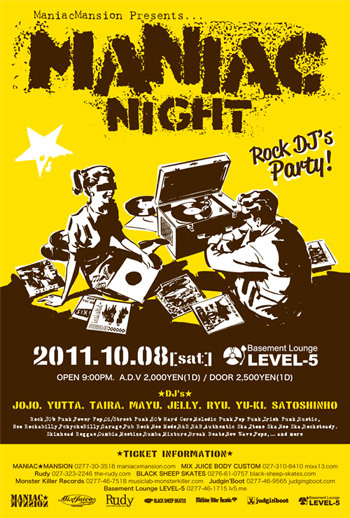 ManiacMansion Presents... 『MANIAC NIGHT』 2011.10.08(sat) @桐生 Basement Lounge LEVEL-5 http://www.lv5.me OPEN 9:00PM. ■DJ's JOJO.YUTTA.TAIRA.MAYU.JELLY.RYU.YU-KI.SATOSHINHO ■ADMISSION: A.D.V 2,000YEN(1D) / DOOR 2,500YEN(1D) ★当日、会場来場者先着30名にMANIAC NIGHT DJによるセレクトCD"SOUND★SYSTEM vol.58"プレゼント! ■TICKET INFORMATION: MANIAC★MANSION 0277-30-3518 http://www.maniacxmansion.com MIX JUICE 高崎 027-310-8410 http://www.mixx13.com/ Rudy 027-323-2246 http://www.the-rud