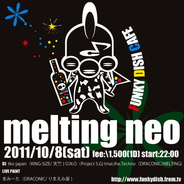 MELTING neo 2011 vol 1 Release Party 10/8(sat) start 22:00~ @FUKY DISH CAFE(TEL 0270-21-6213) (群馬県伊勢崎市大手町13−16) DAY ¥2000/1D W/F \1500/1D Djs tko-japan(KING-SIZE/天竺) O.N.O(Project S.G) Imai.the.Techno(Draconic/MELTING) LIVE Painting まみーた(Draconic/りまえみ屋) イマイザテクノのCDリリースパーティーです。 よろしくおねがいします。