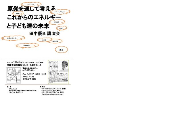 ・日時 10月 8日(土) 14時〜16時(開場13:30) ・場所 高崎市総合福祉センターたまごホール (北高崎駅、徒歩13分) 「原発を通して考えるこれからのエネルギーと子ども達の未来 」 ・参加費 大人 前売1,000円/当日1,200円 高校生 500円 中学生以下 無料 ・定員 300名 ・主催者&連絡先 ・GAIA Spirit 富樫 080-5060-6974 ・足元から地球温暖化を考える市民ネットたてばやし 細田070-6431-4269 ・ナチュラルネットワーク 坂井 090-2453-1113 MAIL komachan9@g