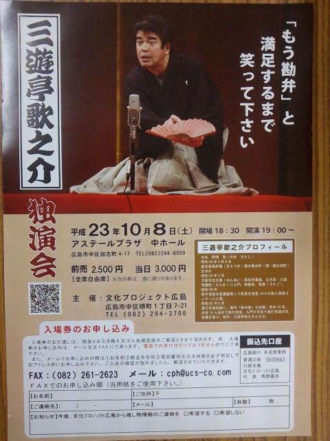2011年10月8日(土) 『三遊亭歌之介 〜独演会〜』 出演:三遊亭歌之介 開演:19時00分 (開場:18時30分) 会場:広島市 アステールプラザ 中ホール 入場券のお申込み:cph@ucs-co.com 前売り2500円 お問合せ:メッセください 「もう勘弁」と 満足するまで 笑って下さい
