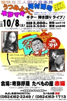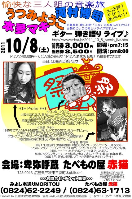 『愉快な三人組の音楽旅』 うつみようこ(ex.メスカリン・ドライブ) 河村博司(ex.ソウル・フラワー・ユニオン) 本夛マキ(ex.アナム&マキ) 10/8(土)pm7:15開場、pm8:00開演 卑弥呼蔵 たべもの屋 赤猫 前売券3000円、当日3500円 ※先にワンドリンクオーダー500円 チケットオーダーHP ⇒ http://www.mhst.jp/2011_10_8_sannin_live.htm うつみようこHP ⇒ http://udon.sdri.co.jp/yokoloco/ 河村博司HP ⇒ http://www2.plala.or.jp/k-mura/top.html 本夛マキHP ⇒ http://honda39.exblog.jp/ ※会場の都合によ