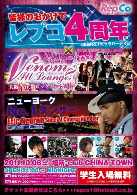 2011/10/08(sat)..... また新たな一歩を! みんなのおかげで我々"Rep Co."は無事4周年を迎えることになりました! 4年間ありがとうございます!! ってことでやるでしょ〜 パーティー! しかもスーパーなのをっ!! 今回は3つの爆弾を一気に落とします!! まずその1!! 「Rep Co. 4th Ann. Party!!」 広島で他に類を見ないグッドパーティーに成長した、 ダンサー、DJによる広島を熱くする俺らのパーティー4周年!! もちろん学生入場無料も継続!! その2!! 「Venom Ill Lounge in 広島!!」 大阪でマジ鉄板パ