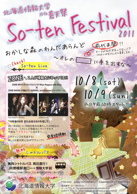 【出演】 Miyu Nagase with Ring、Jack&Queen 【場所】 北海道情報大学・松尾記念館講堂 【日程】 平成23年10月8日(土) 開場15:00/開演16:00 【チケット】 無料招待制(抽選・事前エントリーが必要となります・限定300枚) 応募数が席数に達した時点で、応募は終了いたします (10/5を前に終了する場合がございますので、お早めにご応募ください) 【北海道情報大学・大学祭実行委員会】(011-384-0135) http://www01.do-johodai.ac.jp/so-tensai/ [Twitter] http://twitter.com/#!/souten_staff [So-ten LIVE 20