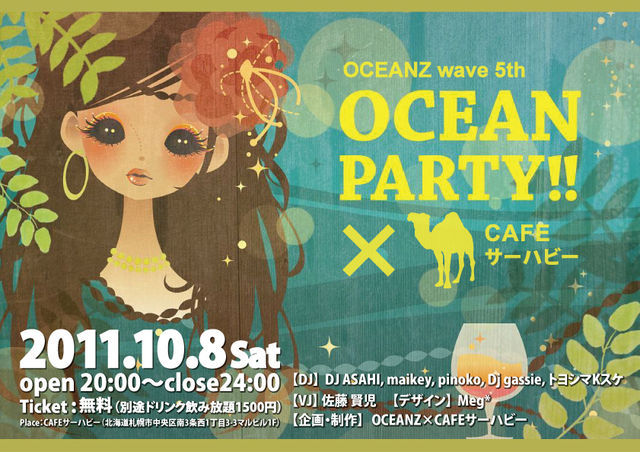みなさま、いつもありがとうございます! 「OCEAN PARTY!!」という札幌のカフェやバーで 定期的に行われているクラブイベント企画がありまして 10/8(土)はサーハビーとのコラボです!! ============================================== OCEANZ wave 5th OCEAN PARTY!!×CAFE サーハビー 10/8(土) open 20:00 〜 close 24:00 Ticket: 無料(別途ドリンク飲み放題1500円) Place: CAFEサーハビー 札幌市中央区南3条西1丁目3-3マルビル1F ---------------------------------------------- 【DJ】 DJ ASAHI maikey pinoko